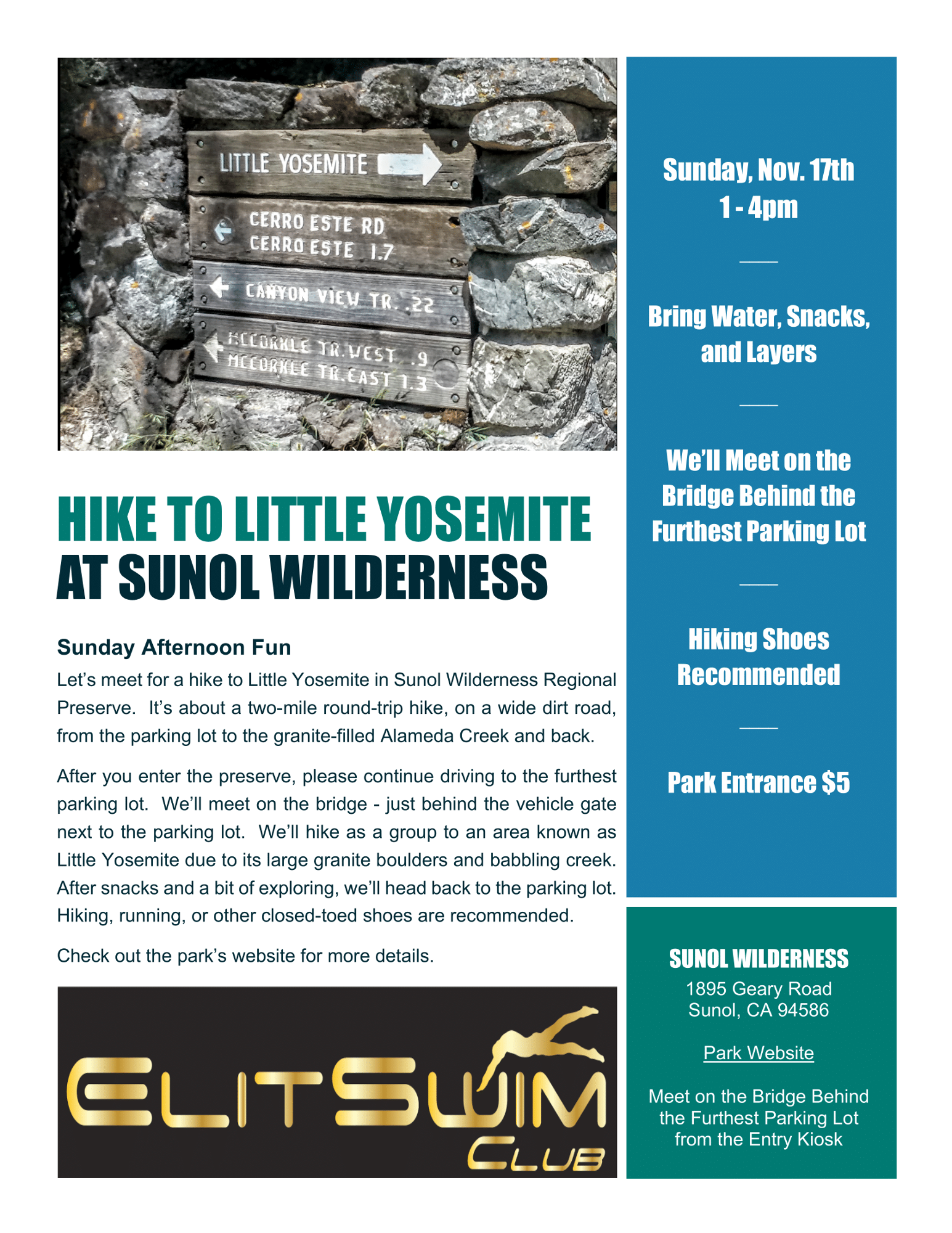 ELIT Hike to Little Yosemite at Sunol Wilderness Preserve. Sunday Nov 17th!